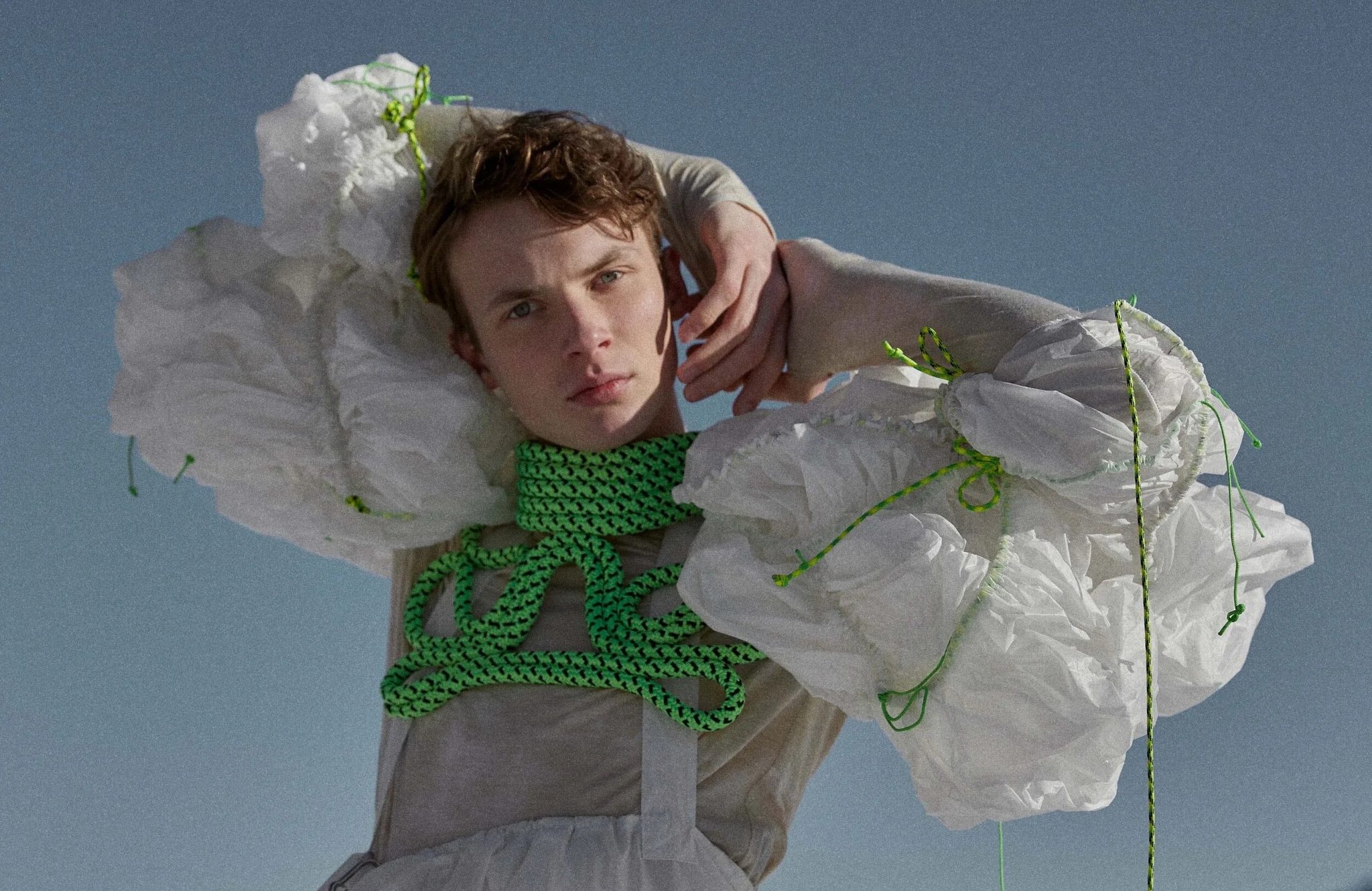 Die ursprüngliche Inspiration waren die Tuareg. Während meiner Reise durch Marokko 2019 entwickelte ich eine große Faszination für deren Kleidung und Silhouetten. Es beeindruckte mich, auf welch funktionale Weise sie ihre Kleidung verwendeten. Ich fing an, mich auch für ihren nomadischen Lebensstil zu interessieren. Bedenkt man die momentane Situation, mit Klimawandel, Umweltverschmutzung und Naturkatastrophen (um nur ein paar Dinge zu nennen), kam ich auf die Frage: Wie wird unsere Gesellschaft zukünftig aussehen. Ich bildete mir ein, es wäre eine Dystopie, und in meiner fiktiven Geschichte sind die Menschen daher gezwungen, sich wieder an den nomadischen Lebensstil anzupassen. Um die genannten Probleme zu thematisieren, beruht das Konzept auf Nachhaltigkeit. Ziel der genderneutralen Kollektion ist es, Avantgarde-Mode zu kreieren, in der alle Materialien zu 100% aus Upcycling bestehen – die ganze Kollektion ist aus Segeln und Kletterseilen hergestellt.